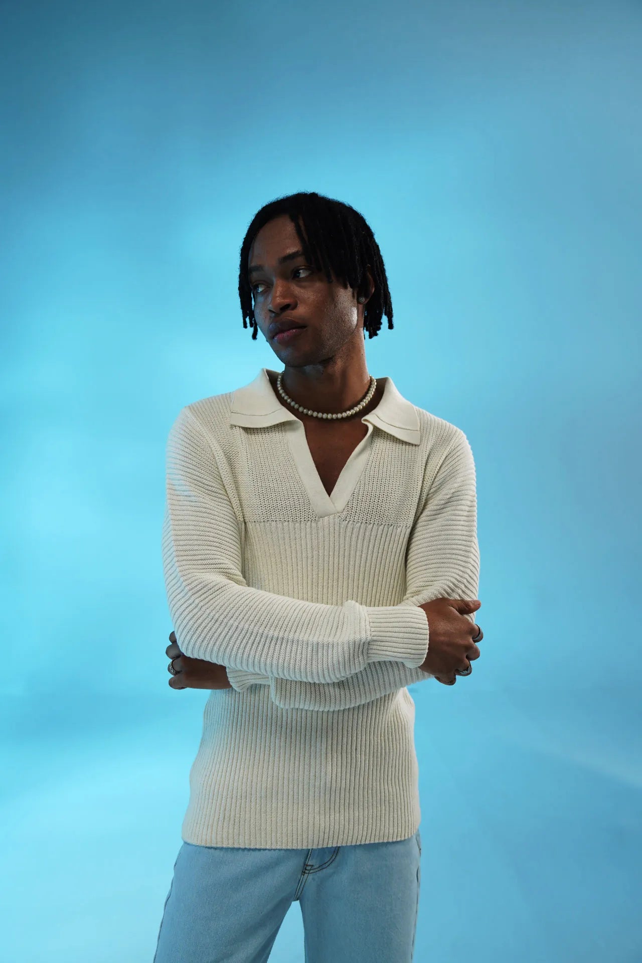 · Deep polo neckline with a modern, open V cut
